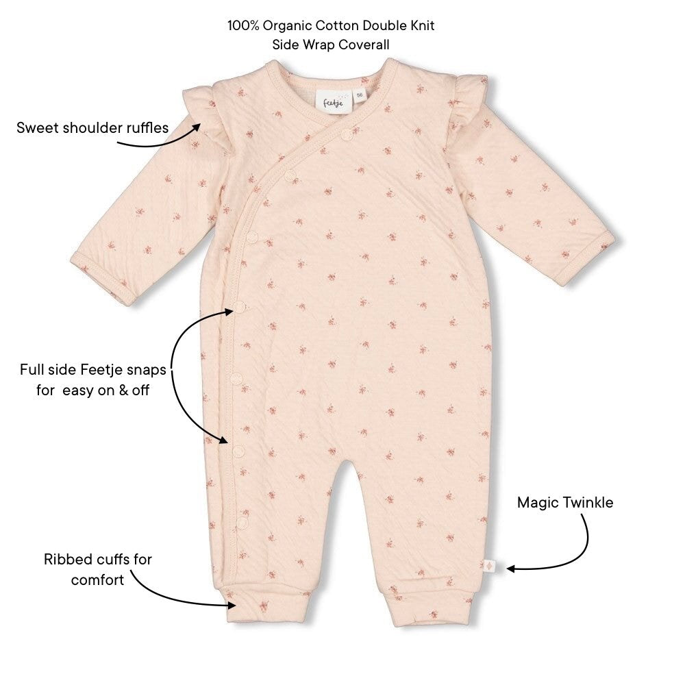 Designed with sweet shoulder ruffles, a full side wrap opening with Feetje snaps for effortless on-and-off, and soft ribbed cuffs to keep little legs cozy. Finished with the signature Magic Twinkle side tab — a tiny reminder that even the smallest details matter.