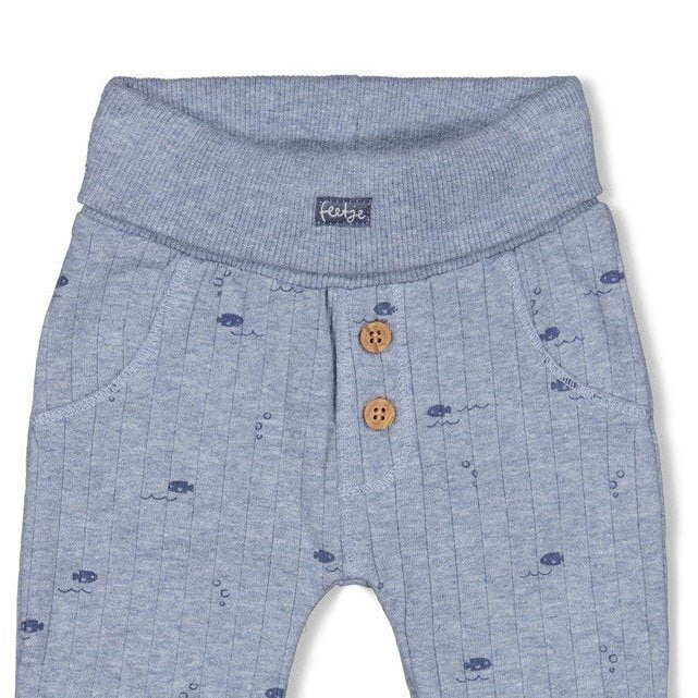The design is elevated by a playful all-over print of tiny fish and bubbles, which was hand-designed in Holland to capture the serene spirit of the Blue Ocean collection. For a secure and comfortable fit, the pants include a soft knit roll-over waistband and matching ribbed ankle cuffs. Finished with a decorative two-button wooden placket at the front, functional side pockets, and a classic back pocket, these pants represent Feetje’s commitment to quality and whimsical style.