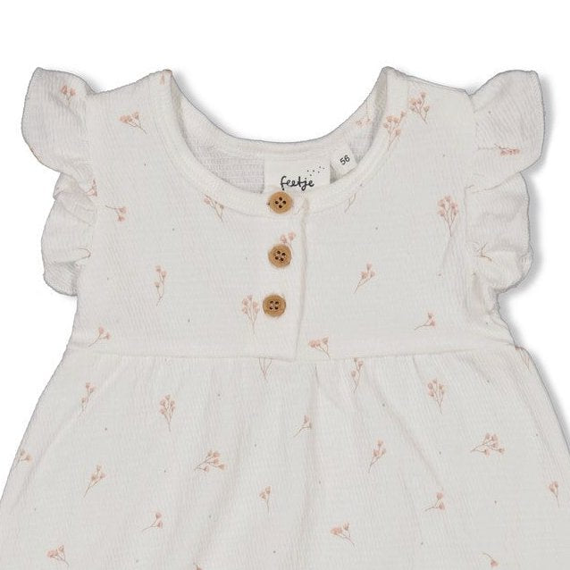 The design is elevated by a delicate all-over floral print in soft, muted tones that perfectly capture the essence of the Delicate Flower collection. For effortless dressing during morning snuggles, the dress features functional wooden-look buttons at the front. The feminine silhouette is finished with whimsical ruffled sleeves, a soft gathered waistline, and the signature "Magical Twinkle" side tab label.