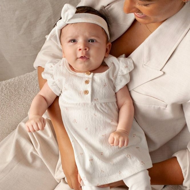 Crafted from a premium blend of 91% Organic Cotton, 8% Sustainable Polyester, and 1% Sustainable Elastic, this dress features a specialized Crinkle Jersey knit. This unique fabric provides a lightweight, breathable feel with a refined tactile finish that is incredibly gentle against the skin, making it ideal for everything from family gatherings to quiet cuddles. Built for longevity, this keepsake piece maintains its beautiful texture and shape through every precious moment.