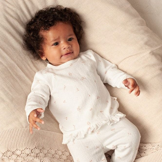 Featuring our  delicate all-over floral print that captures the essence of the Delicate Flower collection. For effortless dressing during morning snuggles, our top includes functional snap buttons at the shoulder. The feminine silhouette is finished with a charming ruffled hemline, a sweet heart logo patch on the back, and the signature "Magical Twinkle" side tab label.