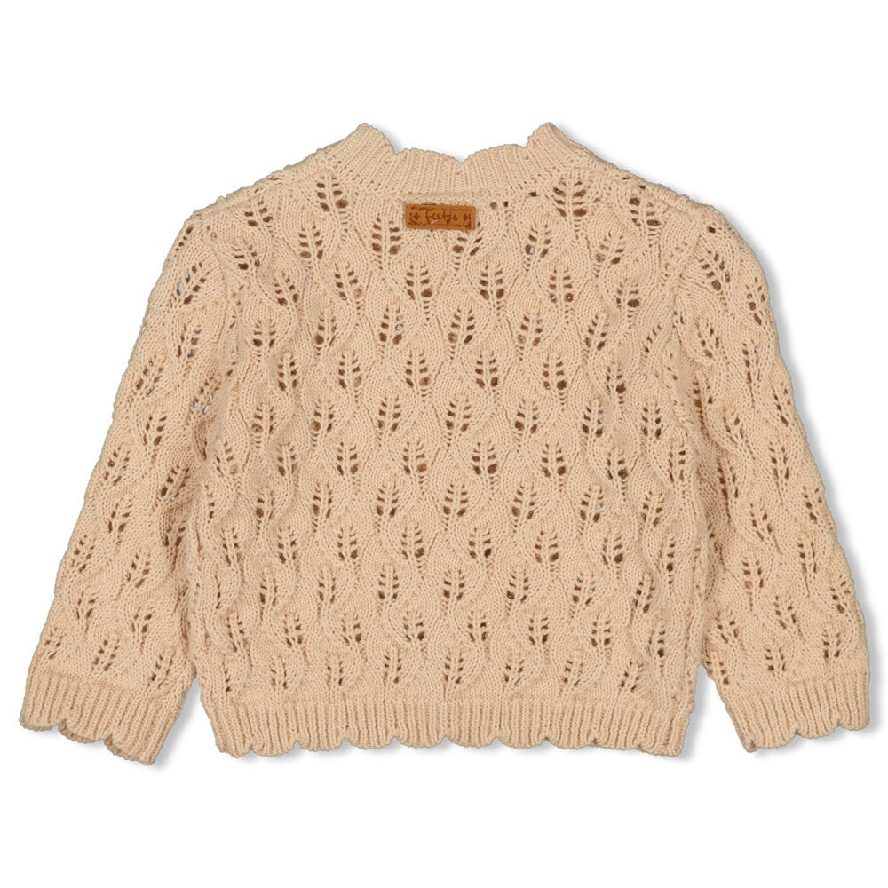Ultra-soft organic cotton in a beautiful openwork knit, featuring delicate scalloped edges and a faux-leather signature label—a timeless layer for every little adventurer.