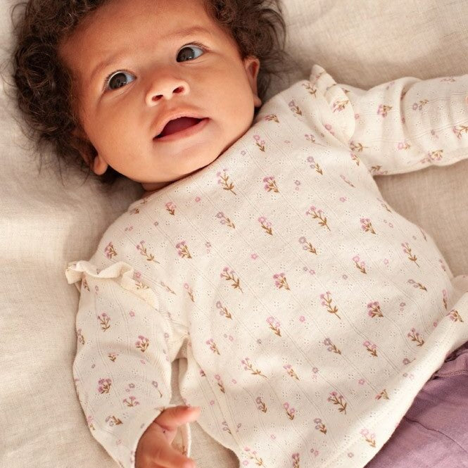 Ultra-soft organic cotton pointelle, sweet ruffled shoulders, and a delicate all-over floral print that makes everyday dressing feel like a spring garden.