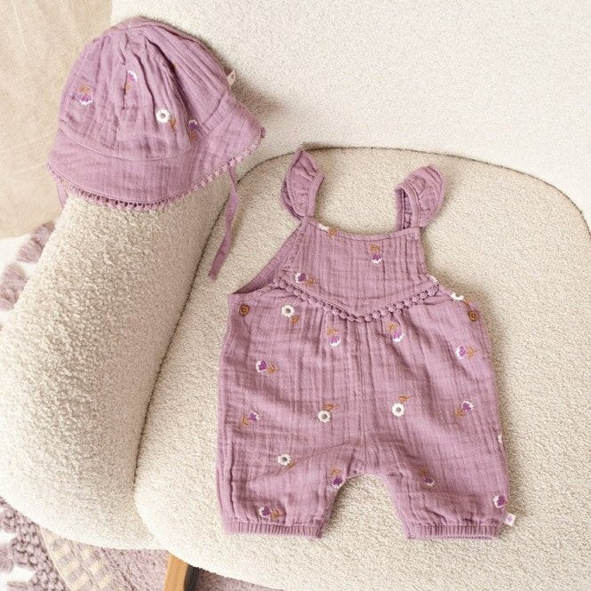 Ultra-soft organic cotton mousseline, delicate pom-pom trim, and hand-designed floral embroidery that keep her cool and shaded on the brightest days.