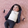 Our baby’s reversible 2-in-1 jacket is made with Plush 100% Sustainable Polyester Faux Fur on one side and 94% Organic Cotton + 6% Sustainable Elastic Single Jersey Peached Inside on the other, with a soft layer of 100% Sustainable Polyester Padding (60G) in between.
