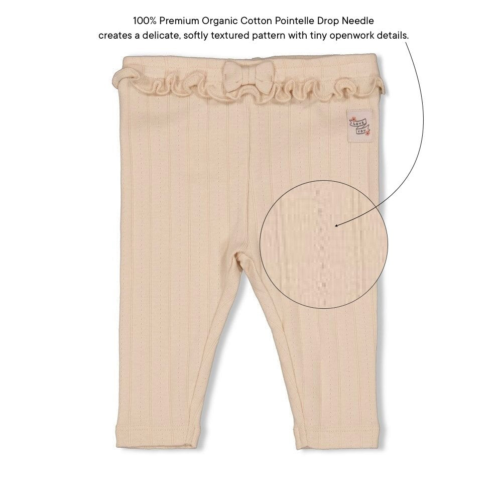 Our leggings are made from 100% Organic Cotton in a Pointelle Drop Needle Rib Knit, creating a delicate, softly textured pattern with tiny openwork details.
