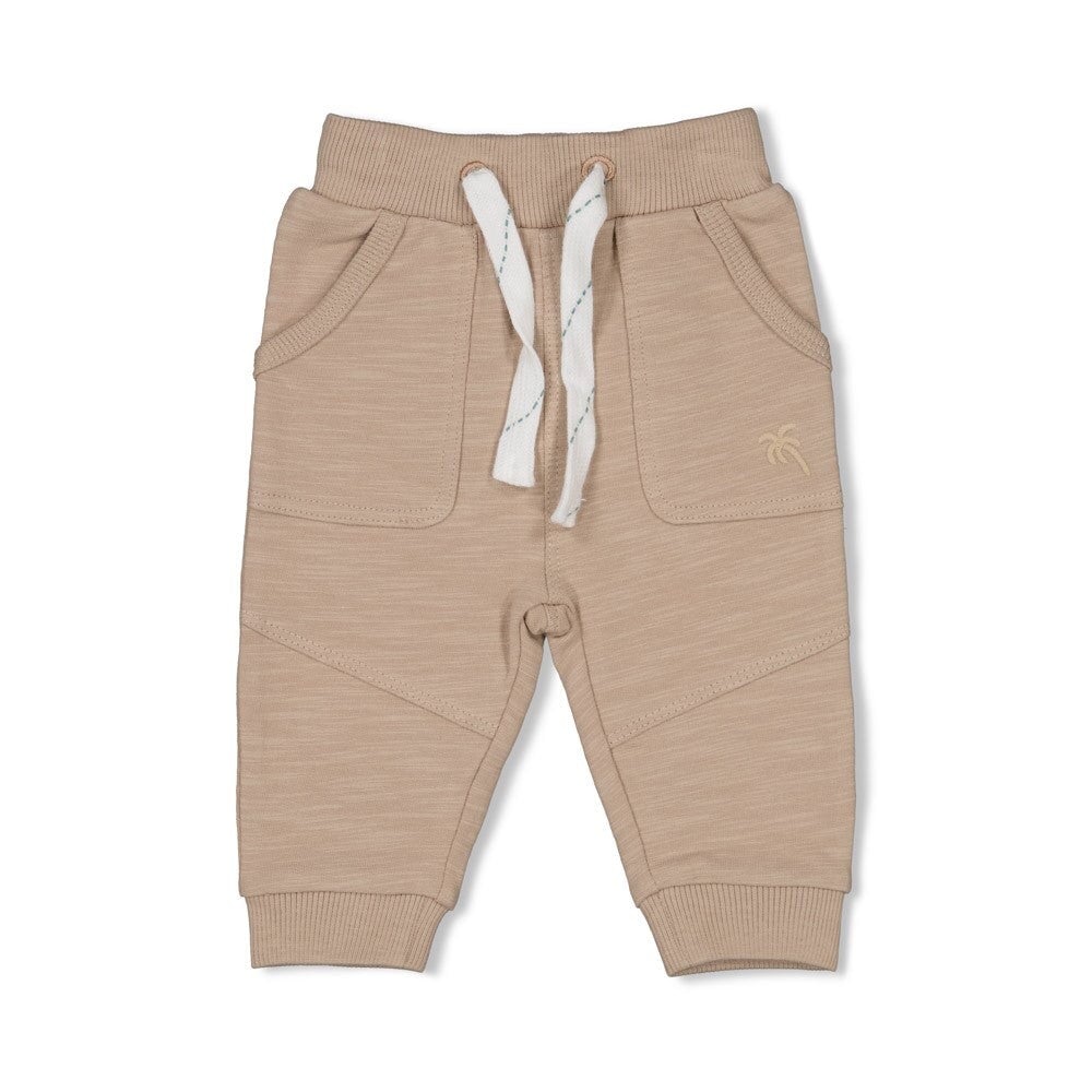 The design is elevated by thoughtful, desert-inspired details, including a functional drawstring waist with contrasting cord accents for a secure, adjustable fit. The front features spacious patch pockets for tiny treasures, while the back includes a single pocket adorned with a signature woven tab. With ribbed ankle cuffs and a comfortable, relaxed silhouette, these pants perfectly capture the adventurous spirit of the You Croc My World collection. Finished with the iconic "Magical Twinkle" branding, they represent Feetje’s commitment to quality and playful style.